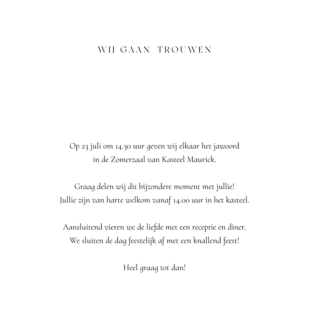 Je kunt deze trouwkaart eenvoudig zelf bewerken in onze editor: pas de tekst aan, kies je favoriete lettertype en voeg extra details toe als je dat wilt. Zo wordt de kaart helemaal van jullie.