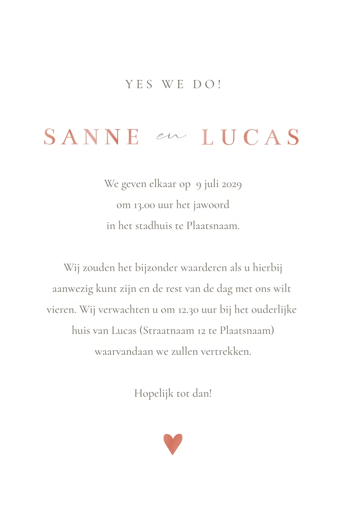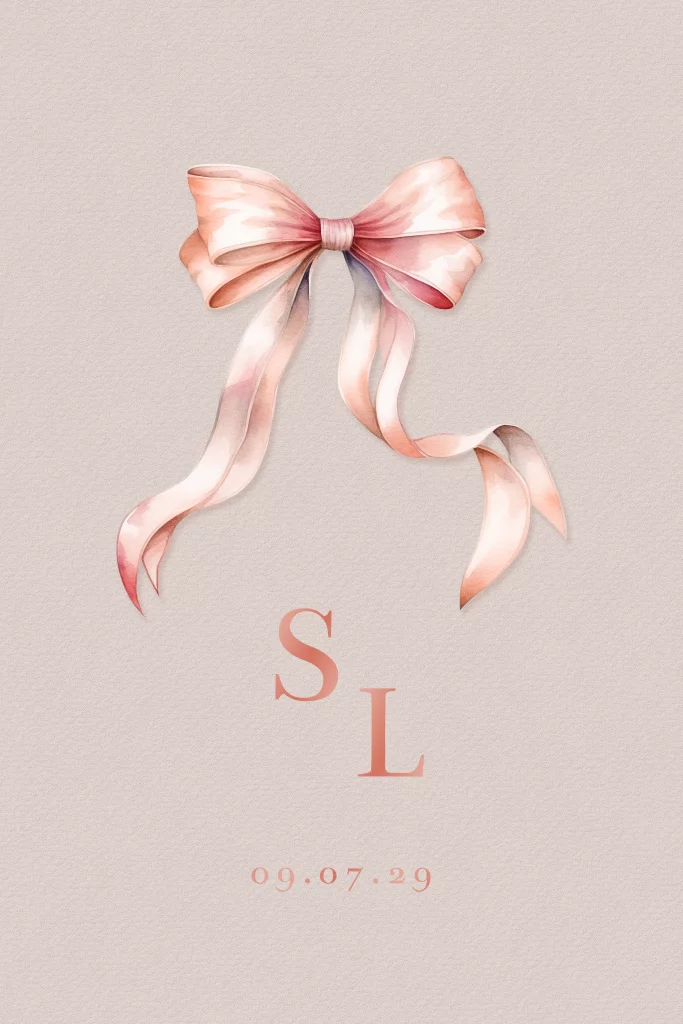 Een stijlvolle trouwkaart met een sierlijke roze strik. Op de voorkant springen jullie initialen eruit in hoogglans. De kaart heeft een eenvoudige, maar chique uitstraling en krijgt dankzij de hoogglans een feestelijk karakter. Personaliseer de kaart gemakkelijk in de editor en maak er jullie unieke uitnodiging van.