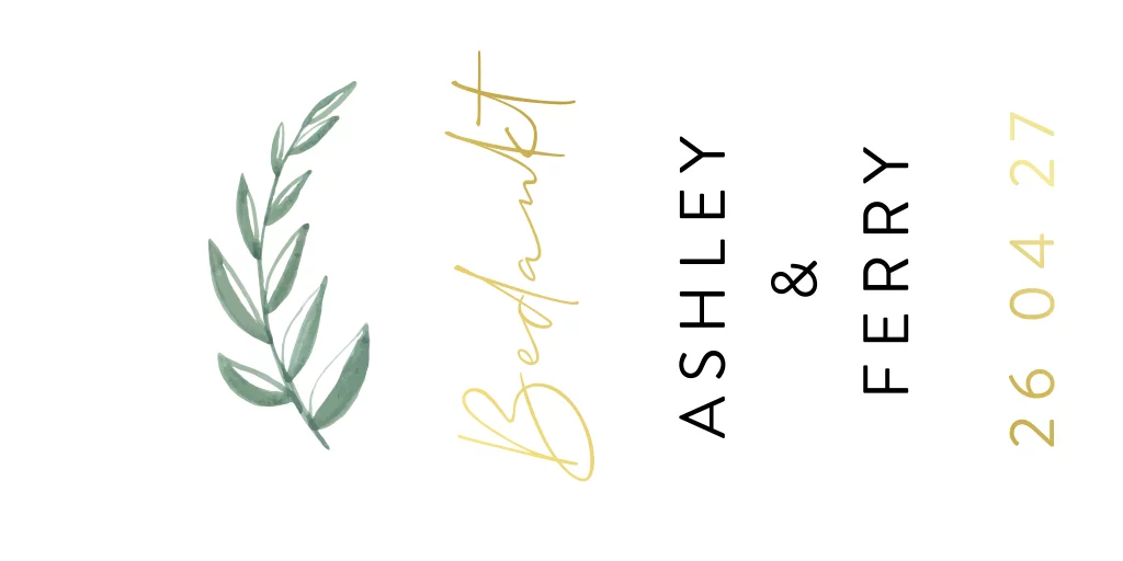 Geef je een bedankje aan het einde van je trouwfeest? Dan zijn dit hele handige labelkaartjes om met een touwtje, koord of lint aan je bedankje te hangen. Leuk ontwerp met groen blaadje en goudfolie.