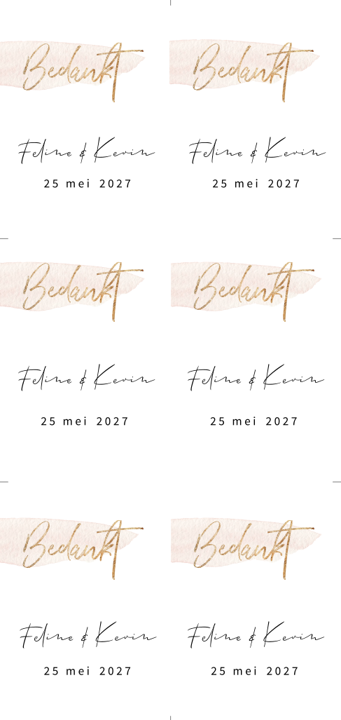 DIY bedanklabels voor aan een aandenken van jullie bruiloft. Dit stijlvolle ontwerp is versierd met roze waterverf en goudkleurige typografie. Onderaan het label is ruimte voor jullie namen en de datum en op de achterzijde kun je eventueel nog een boodschap kwijt. Let op, deze kaartjes moet je zelf nog los snijden of knippen.