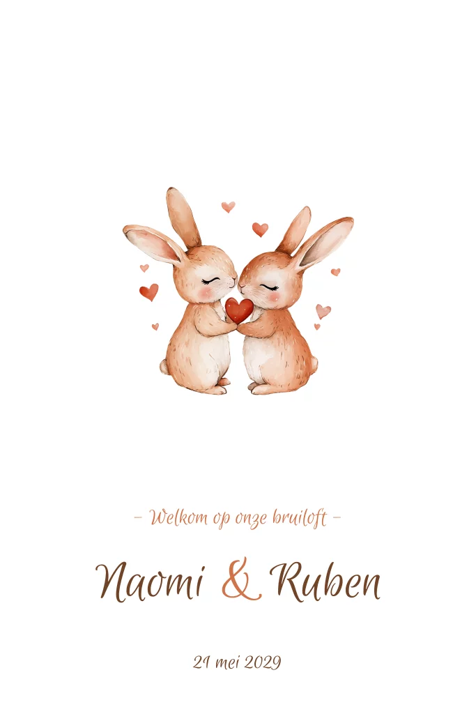 Deze unieke trouwkaart met afgeronde hoeken toont twee verliefde konijntjes die samen een hartje vasthouden. Een warm ontwerp dat perfect past bij een lentebruiloft of een bruiloft met dierenthema. De tekst “Welkom op onze bruiloft” en de namen van het bruidspaar staan centraal in een handgeschreven lettertype.
