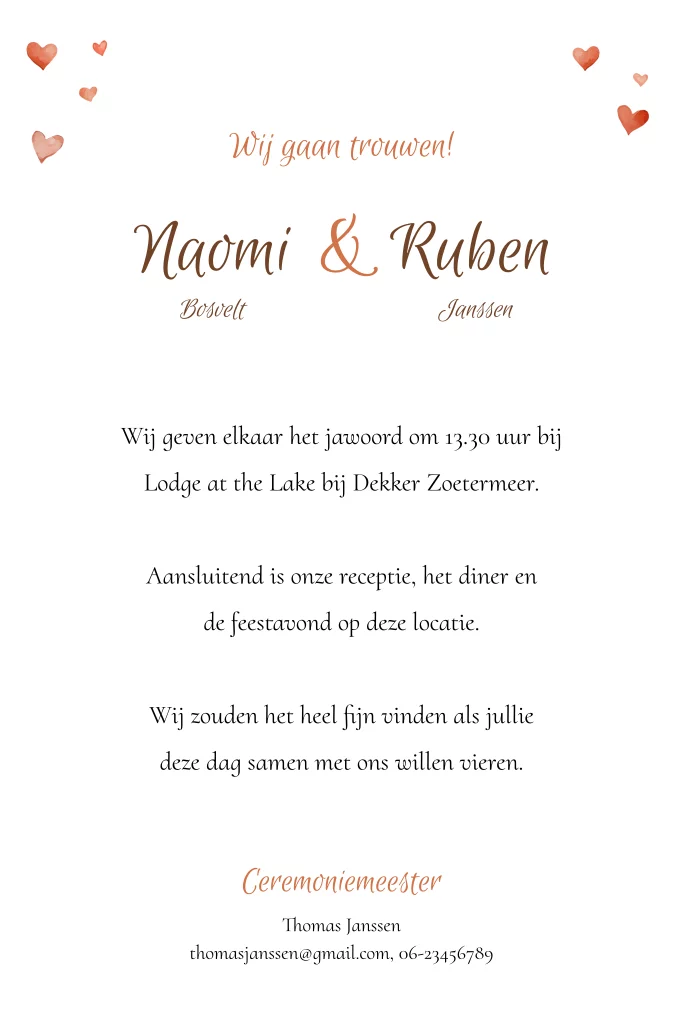 Deze kaart is ideaal voor stellen die op zoek zijn naar een grappige trouwkaart met een rustige uitstraling. Open in de kaarteneditor en pas naar eigen inzicht aan. Wil je een ander formaat? Neem dan contact met ons op dan passen we dit voor je aan.