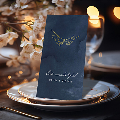 Plaats deze stijlvolle menukaarten op de tafels tijdens jullie huwelijksdiner om de tafelschikking helemaal af te maken. Pas de teksten en lettertypes zelf aan in onze editor. Deze menukaart past perfect bij onze trouwkaart 'Donkerblauwe trouwkaart met lijntekening van handen in goudfolie'.