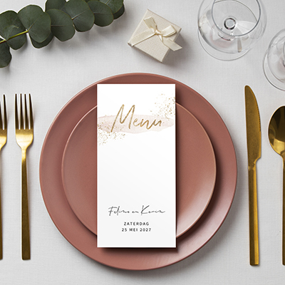 Menukaart met zachtroze waterverf en gouden verfspetters. Op de voorzijde staat met gouden typografie de tekst 'Menu'. Op de achterzijde is ruimte voor alle gerechten. Pas de gegevens in onze ontwerptool naar eigen voorkeur aan.