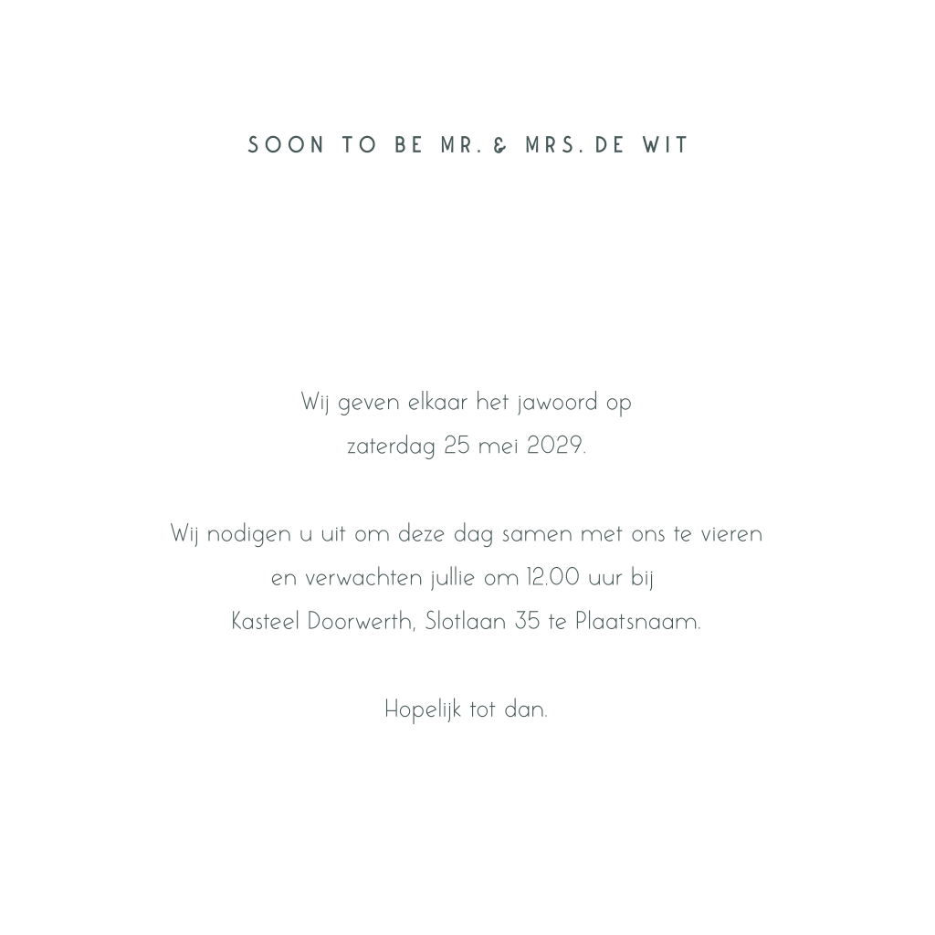 Op zoek naar elegantie en eenvoud? Ontdek onze donkergroene trouwkaart met een opvallend "YES" in een zachtere tint en klein "WE DO" eronder. Jullie namen schitteren in glanzend goudfolie, een subtiele knipoog naar de prachtige verbintenis die voor jullie ligt. Pas de trouwkaart eenvoudig aan met de editor en maak de kaart helemaal naar wens.
