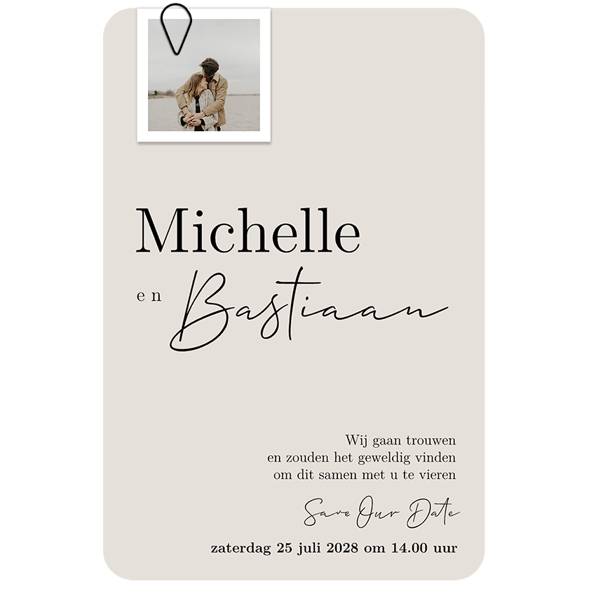 Ontdek onze beige trouwkaart, verfraaid met een uniek foto label dat met een paperclip is bevestigd. De combinatie van beige, losse kaarten aan elkaar bevestigd met een paperclip, lint of koord is momenteel zeer geliefd. Jullie namen worden subtiel weergegeven in een mix van klassiek en speels lettertype. Personaliseer eenvoudig online en bestel een drukproef voor een voorproefje van jullie unieke aankondiging.