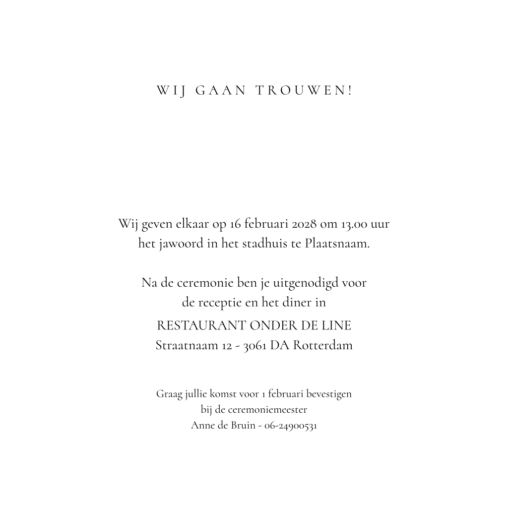 Op zoek naar een minimalistische trouwkaart die jullie liefde symboliseerd? Deze witte trouwkaart met voorop een hart gemaakt van twee vingerafdrukken en gedrukt in glanzend goudfolie is perfect. Pas de kaart naar wens aan, je kunt ook voor een andere kleur folie kiezen.