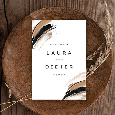 Moderne trouwkaart met waterverf vegen in bruin, zwart en goud in de hoeken. Jullie namen en de trouwaankondiging zijn te vinden in het midden van deze kaart in een strak lettertype. Extra informatie over jullie huwelijksdag en de tijdlijn staan aan de binnenkant. Je kunt deze eigentijdse trouwkaart zelf aanpassen met de editor.