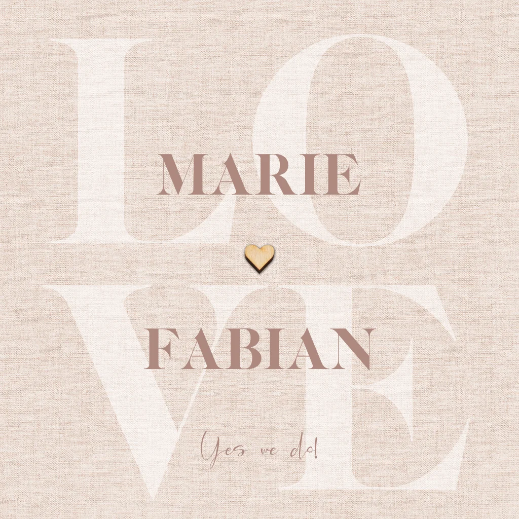 Deze romantische trouwkaart heeft een warme linnenlook achtergrond met groot het woord LOVE subtiel op de achtergrond gedrukt. De namen van het bruidspaar staan in stijlvolle, moderne typografie, met daartussen een klein houten hartje dat je zelf op de kaart plakt voor een unieke en ambachtelijke uitstraling.
