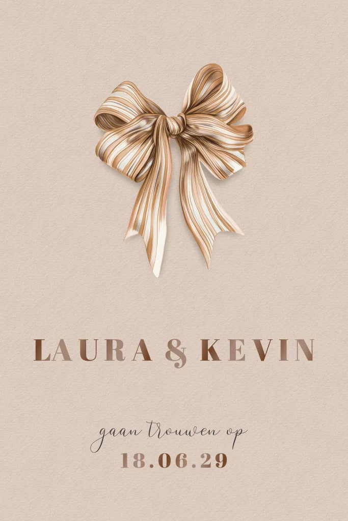 Ontwerp deze stijlvolle trouwkaart met een romantische uitstraling. Deze luxe kaart, met een zachte beige achtergrond en een beige gestreeptje strik, is volledig te personaliseren met een handige online tool. De namen zijn gedrukt in hoogglans. Pas de tekst en details eenvoudig aan en creëer een unieke uitnodiging die perfect past bij jullie trouwdag!