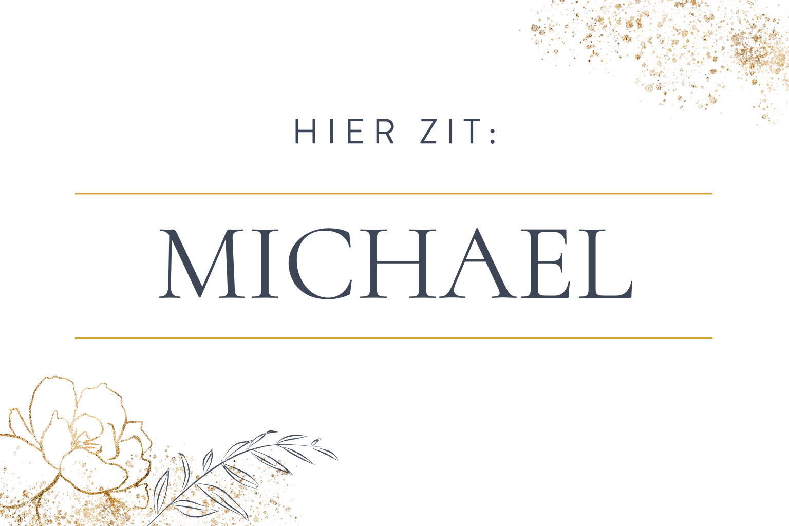 Los naamkaartje voor op tafel tijdens het bruidsdiner met goudkleurige bloemen.