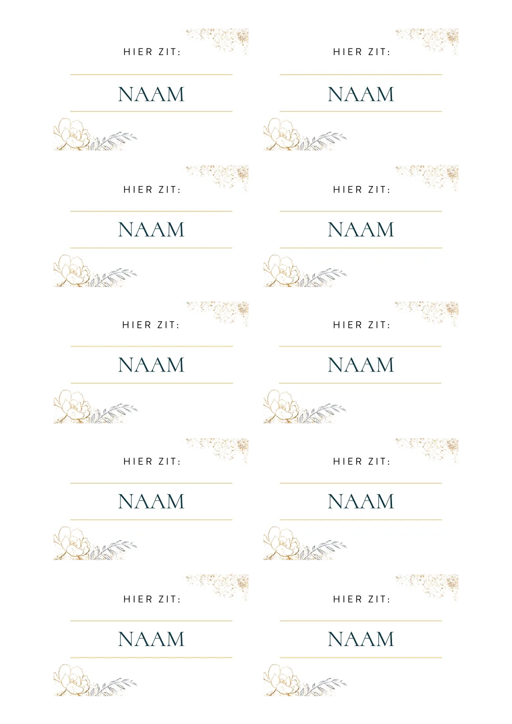 Los naamkaartje voor op tafel tijdens het bruidsdiner met goudkleurige bloemen.