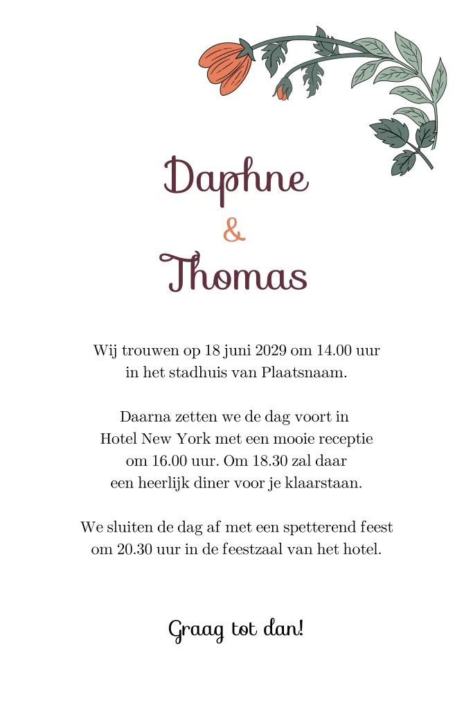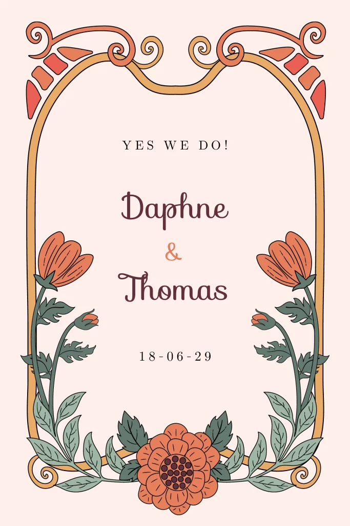 Een Art Nouveau trouwkaart, gekenmerkt door sierlijke lijnen, decoratieve bloemen en warme kleuren. Het frame omlijst de namen en trouwdatum op een speelse manier. De kaart combineert klassieke ontwerpen met een moderne touch, waardoor hij perfect past bij een romantische en stijlvolle bruiloft. Pas de kaart gemakkelijk aan in onze online editor en maak hem helemaal persoonlijk.
