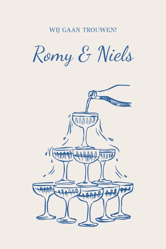 Speelse trouwkaart voor koppels die een feestelijke uitnodiging zoeken. De kaart heeft een minimalistisch ontwerp met een zachte, lichte achtergrond en een handgetekende illustratie van een champagne fontein in blauwe tinten, wat zorgt voor een vrolijke uitstraling. De tekst "Wij gaan trouwen!" en de namen van het bruidspaar staan centraal.