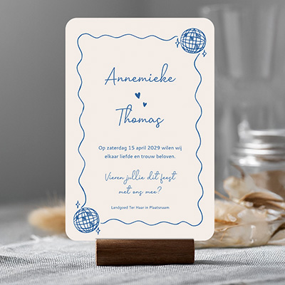 Laat jullie trouwdag stralen met deze unieke trouwkaart, perfect voor een feestelijke bruiloft met een discobal-thema! De kaart heeft een speels, modern ontwerp met golvende blauwe lijnen, hartjes en discobal-illustraties. De uitnodiging is volledig aanpasbaar in onze gebruiksvriendelijke editor, zodat jullie de tekst, kleuren en opmaak naar wens kunnen personaliseren. Bestel eenvoudig en snel jullie voorbeeld trouwkaart en zet de toon voor een onvergetelijk feest!