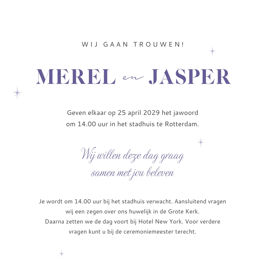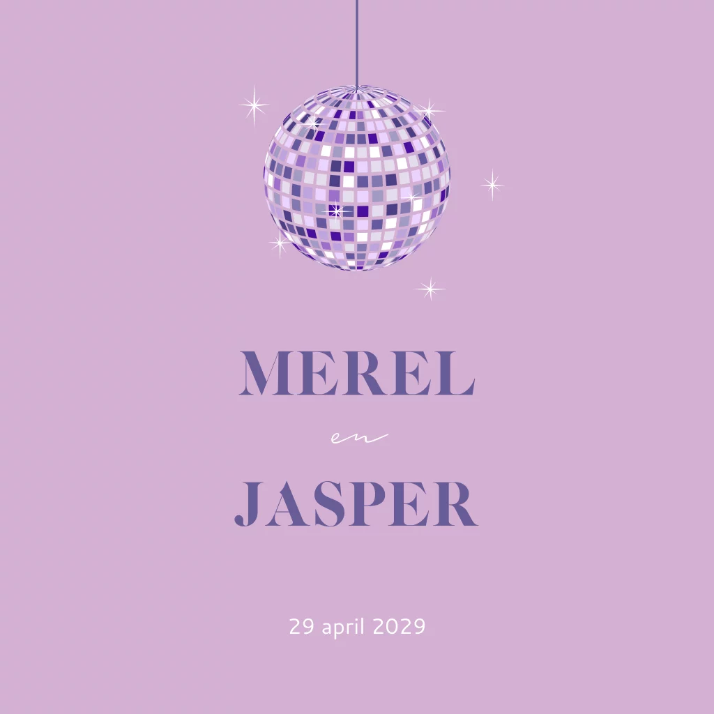 Deze prachtige paarse trouwkaart met een opvallende discobal is perfect voor een bruiloft vol glitter en glamour! Het moderne, vierkante ontwerp is helemaal volgens de laatste trends. De kaart is volledig naar wens aan te passen in onze gebruiksvriendelijke editor. Voeg eenvoudig jullie eigen teksten, kleuren en details toe om er een uniek ontwerp van te maken dat perfect past bij jullie speciale dag. Bestel een proefdruk om het eindresultaat in handen te zien voordat je definitief bestelt. Voor de echte feestliefhebbers is deze kaart dé perfecte uitnodiging om jullie gasten alvast in de feeststemming te brengen!
