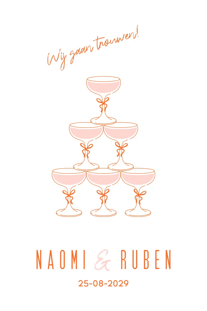 Deze hippe trouwkaart met afgeronde hoeken is perfect voor een moderne bruiloft. Het ontwerp in warme oranje- en roze tinten bevat een grappige illustratie van een piramide van champagneglazen, lekker feestelijk. De tekst "Wij gaan trouwen!" en de namen van het bruidspaar staan in een trendy lettertype.