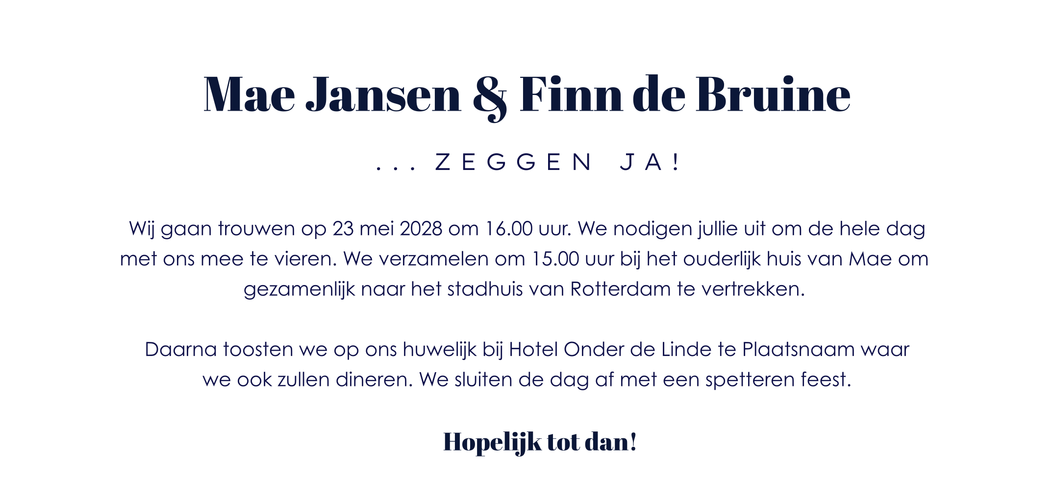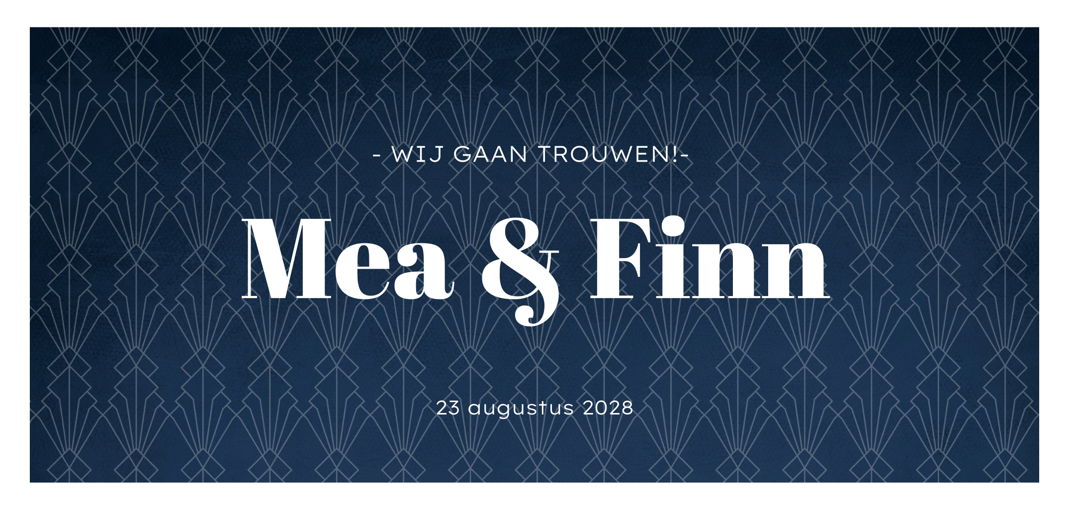 Gaan jullie trouwen in jaren 20 stijl of met het thema 'The Great Gatsby'? Ga dan voor deze trouwkaart met donkerblauw art deco patroon en witte typografie. Op de binnekant is er ruimte voor een leuke foto van jullie. Liever een strak lettertype? Pas dit ontwerp gemakkelijk aan in onze gebruiksvriendelijke ontwerptool.