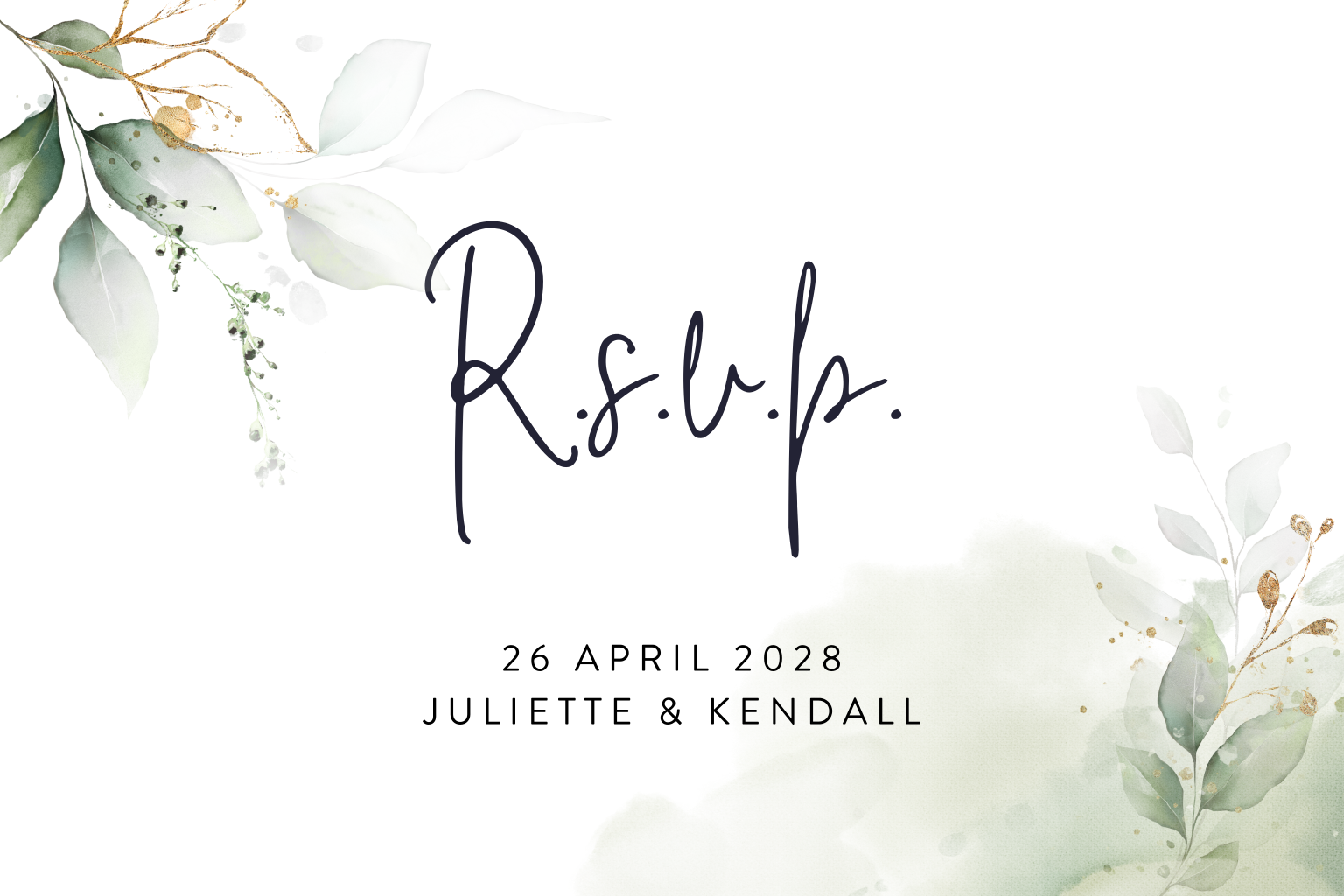 Stuur dit RSVP kaartje mee met je trouwkaarten zodat je gasten kunnen laten weten of ze wel of niet bij jullie trouwdag aanwezig kunnen zijn en met hoeveel mensen. Dit botanische RSVP kaartje is in dezelfde stijl gemaakt als: "Trouwkaart met bladeren en spetters" en "Botanische trouwkaart met eigen foto". Zo past alles mooi bij elkaar.