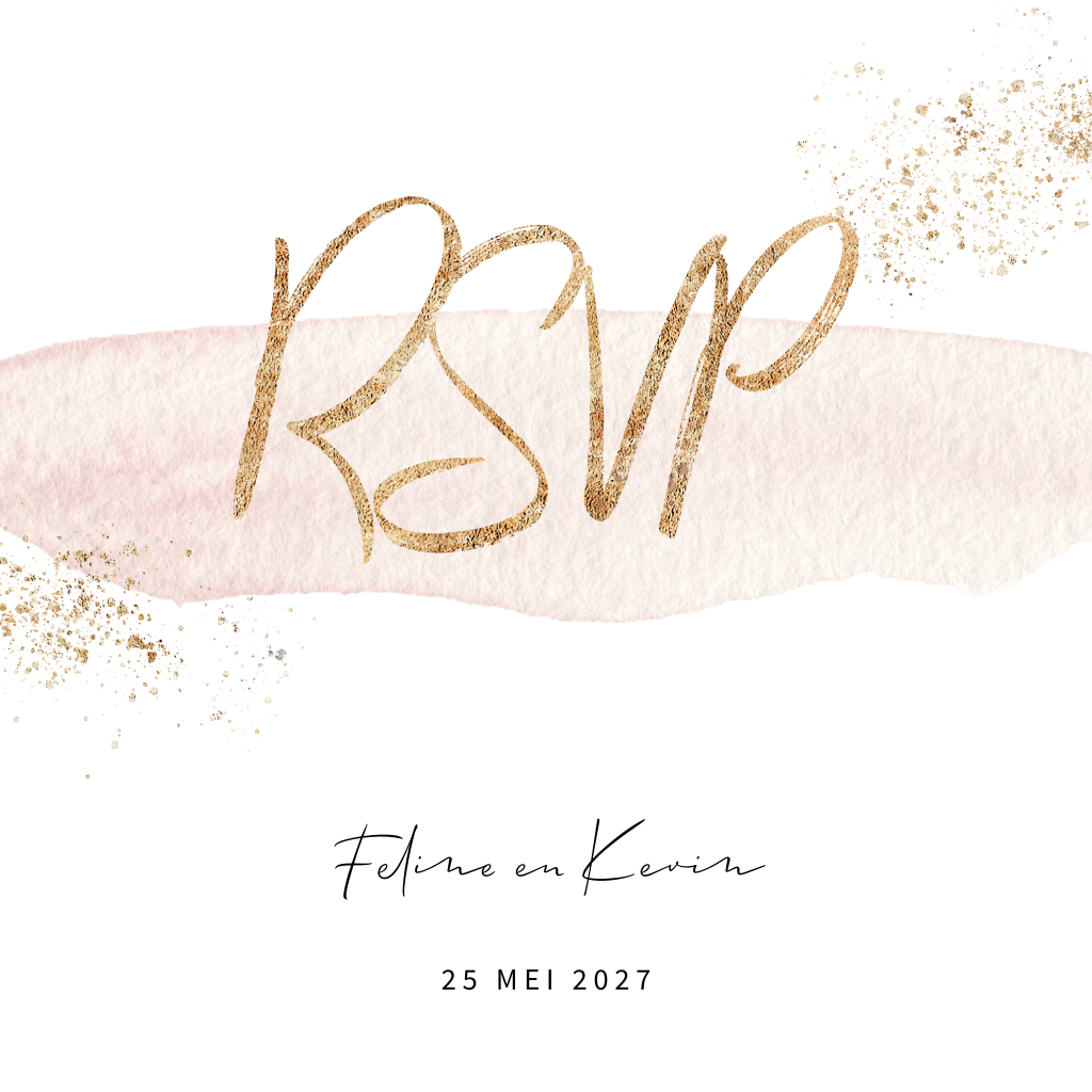 Met deze stijlvolle RSVP kaartjes weet je precies wie er op jouw bruiloft komen. Op de voorzijde zie je een roze strook met waterverf, omringd door spetters. Op de achterzijde kunnen de gasten aangeven of ze aanwezig zullen zijn. Dit kaartje past goed bij deze trouwkaarten: 'Trouwkaart met blush waterverf foto en spetters' en 'Trouwkaart met blush waterverf en gouden spetters'.