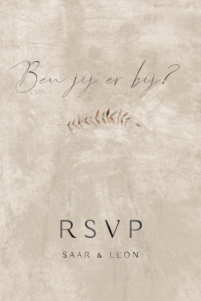 Rustige RSVP kaartje met hoogglans zwarte tekst voorop. De achtergrond heeft een neutrale kleur en een mooie textuur. Deze kaart past perfect bij deze trouwkaart.