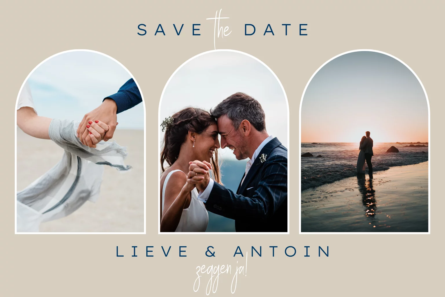 Heb je een mooie fotoshoot van jullie samen laten maken voor je save the date kaart? Op dit ontwerp kun je drie foto's kwijt. Ze staan in hippe bogen met een beige achtergrond die van kleur kunt wijzigen.