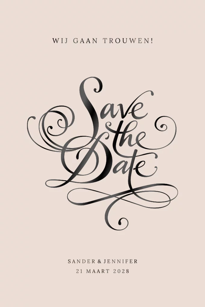 Save the date kaart in beige met de tekst Save the date in een sierlijk, bijna logo design en gedrukt in hoogglans zwart. Achterop staat de tekst en kun je nog een leuke foto van jullie samen kwijt. Pas de kaart naar wens aan en bestel eventueel een drukproef om hem eerst eens in het echt te zien.