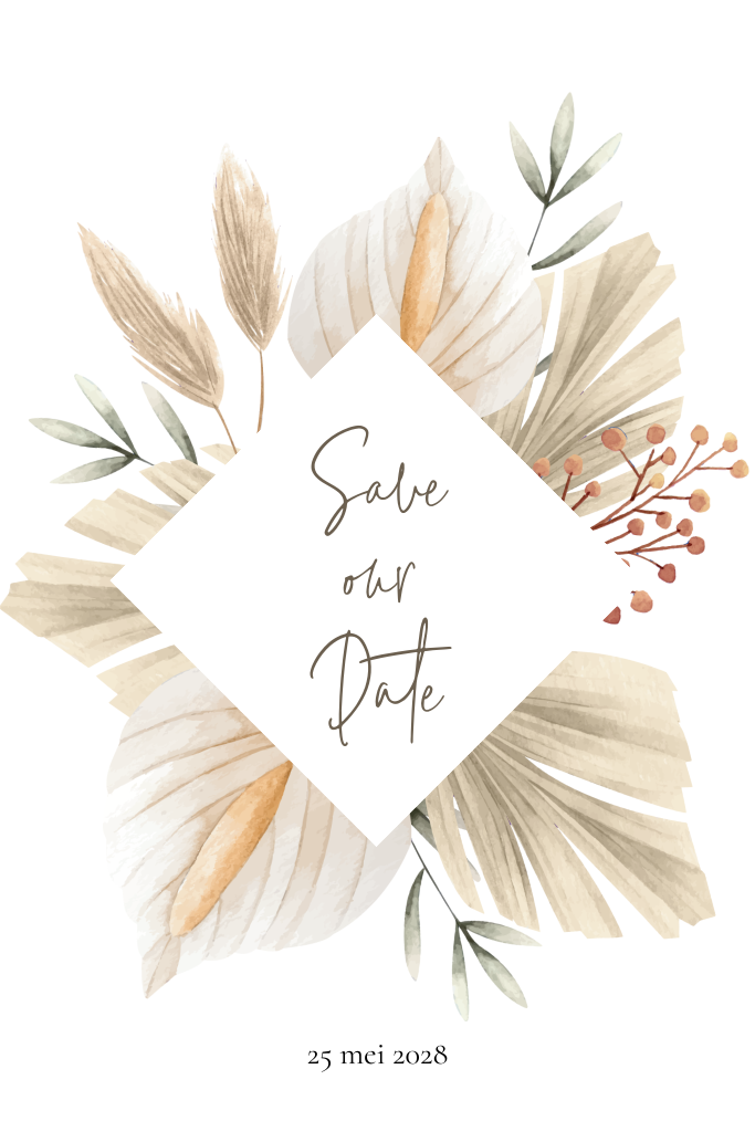 Ben je helemaal fan van de bohemian stijl? Dan is deze echte boho kaart perfect om jullie voorgenomen huwelijk aan te kondigen. Stuur deze save the date naar al je familie en vrienden zodat ze er zeker bij zijn op jullie trouwdag.
