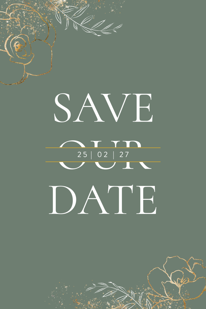 Mooie save the date kaart met groene achtergrond. De kaart wordt omrand door goudkleurige spetters, gouden bloemen en witte bladeren. Met grote vette letters staat er 'Save our date'. De datum staat in een balkje over de tekst 'our'. Op de achterzijde kun je een kort bericht kwijt voor alle gasten. Een stijlvol ontwerp dat goed past bij onze trouwkaart met dezelfde bloemen, spetters en typografie.