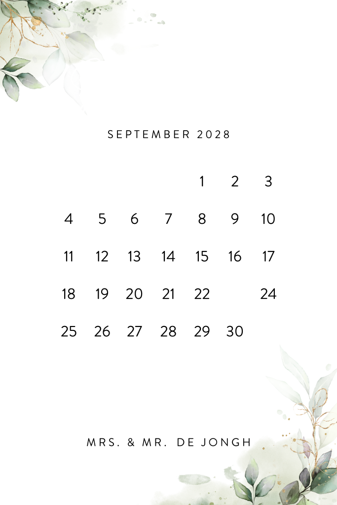 Botanische save the date kaart met een kalender en goudfolie. Op de kalender kun je zelf aangeven op welke datum jullie gaan trouwen. Pas de cijfers zelf aan in onze ontwerptool. Ook kun je de kleuren en lettertypes wijzigen, zo maak je eenvoudig een mooie save the date kaart die perfect bij jullie trouwdag past!