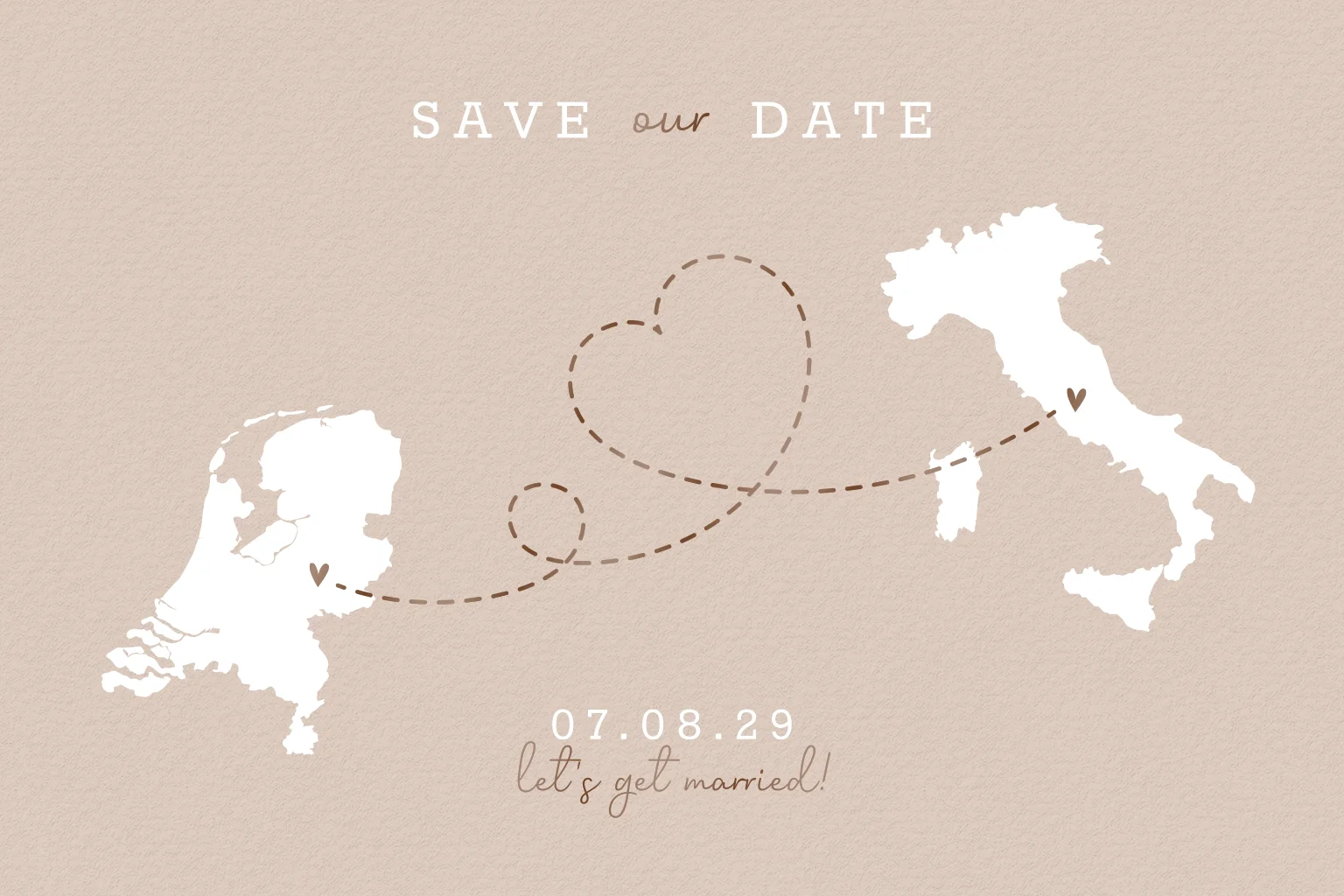 Vieren jullie je bruiloft in het buitenland? Dan is het extra belangrijk om alle gasten ver van tevoren te laten weten wanneer de trouwerij plaats zal vinden! Doe dit met dit mooie save the date kaartje in lichtbruin met donkerbruine hoogglans details. Je kunt de kaart eenvoudig aanpassen in de designtool.