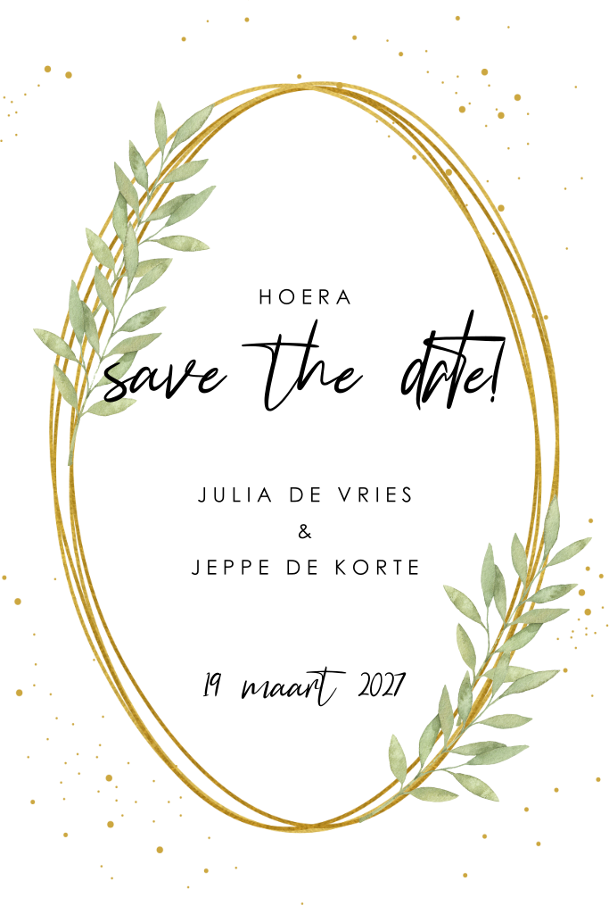 Op zoek naar een save the date kaartje met botanisch tintje? Ga dan voor dit chique ontwerp met gouden kader, groene blaadjes en sierlijke typografie. Kies de bijpassende trouwkaart met naam "Chique trouwkaart met gouden kader en groene bladeren" voor een mooi geheel. Pas dit kaartje naar wens aan in onze ontwerptool.