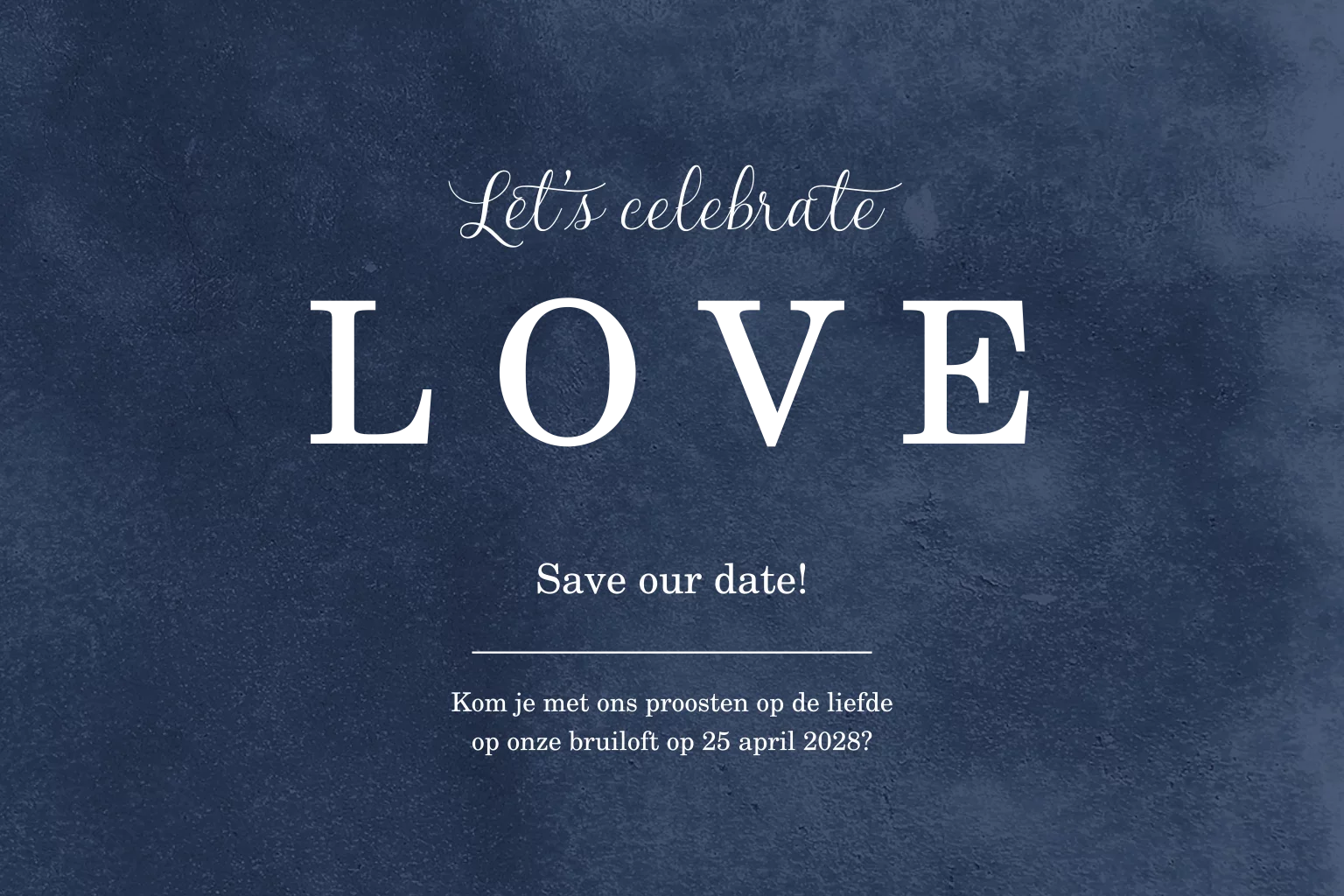 Donkerblauwe save the date kaart met LOVE in goudfolie