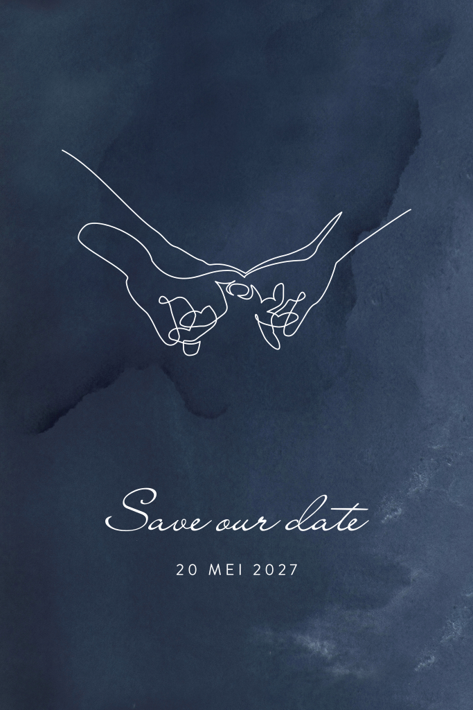 Donkerblauwe save the date met goudfolie lijntekening handen
