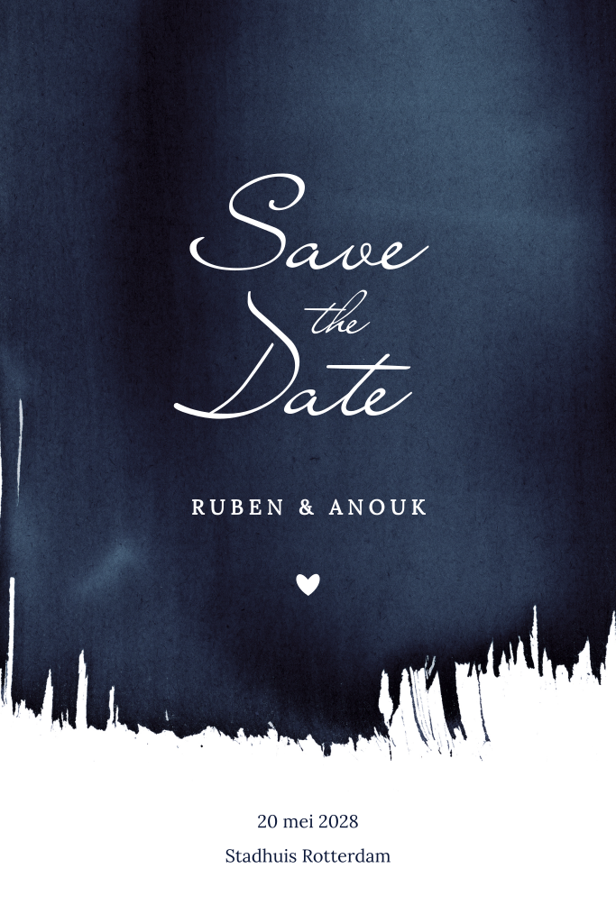 Stoere, donkerblauwe save the date kaart met grove waterverf vegen die tot net boven de onderzijde van de kaart doorlopen. Het grove effect geeft de save the date een stoer karakter wat mooi combineert met de goudfolie tekst.