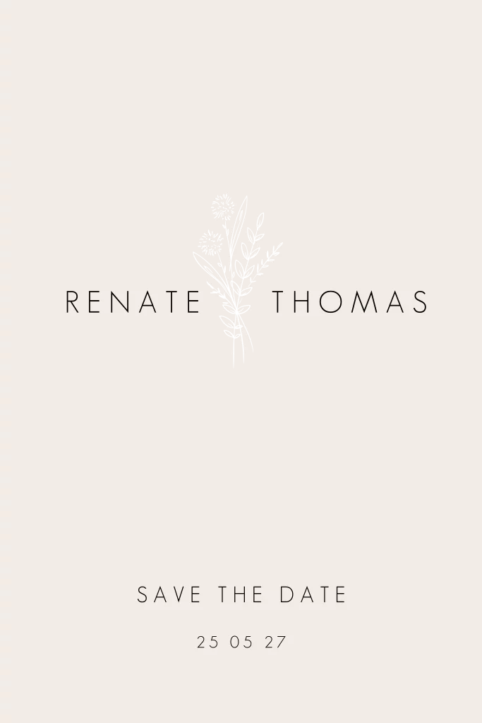 Eenvoudige save the date kaart met ronde hoeken en een stijlvol bosje bloemen in goudfolie. De achtergrond is in de populaire kleur beige. Je kunt deze kaart zelf bewerken in de editor en naar je eigen wens aanpassen.
