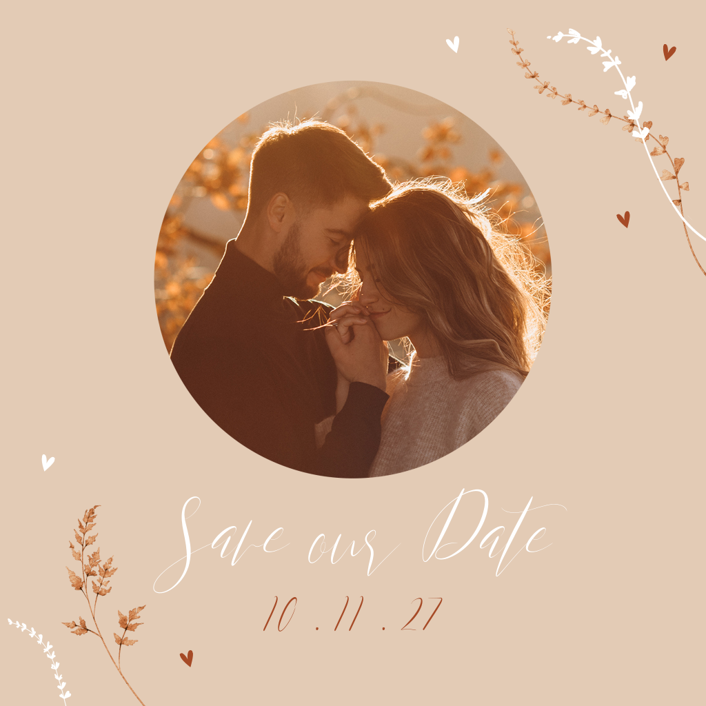 Gaan jullie later dit jaar trouwen? Stuur je gasten dan deze trendy, beige save the date kaart met subtiele, roestbruine bloemen en een mooie foto van jullie samen. Zo vraag je je gasten in stijl jullie trouwdatum alvast te blokken in hun agenda.