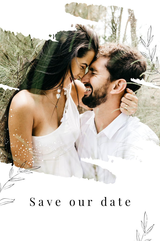 Op zoek naar een save the date kaart met persoonlijk tintje? Ga voor dit ontwerp met mooie, eigen foto en goudfolie spetters. Plaats een foto van jullie zelf in het grillige fotokader en personaliseer de kaart verder in onze handige ontwerptool. De getekende blaadjes en gouden spetters maken dit dit een trendy en chic geheel.