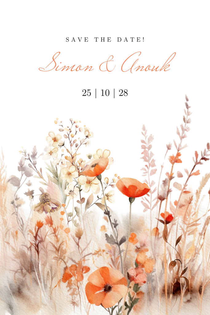 Laat je gasten alvast jullie datum in hun agenda blokkeren, want jullie herfstbruiloft komt eraan! Dit doe je natuurlijk door middel van een mooie Save the Date-kaart, gedecoreerd met de prachtige kleuren van herfstbloemen en klaprozen in warme oranje en diepe bruintinten. Jullie kunnen de laatste hand aan de details leggen door deze kaart naar wens aan te passen via onze handige online tool. We hebben ook een bijpassende trouwkaart.