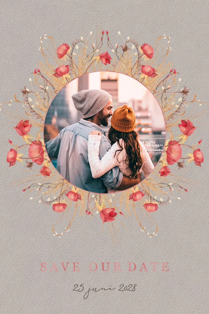Zoek je een hippe save the date kaart om jullie trouwdatum alvast door te geven aan jullie gasten? Deze hippe save the date kaart met droogbloemen en takjes is helemaal volgens de laatste trends. In het midden is ruimte voor een mooie foto. De rode hoogglans details maken de kaart extra feestelijk. Pas de kaart naar wens aan en bestel een drukproef.