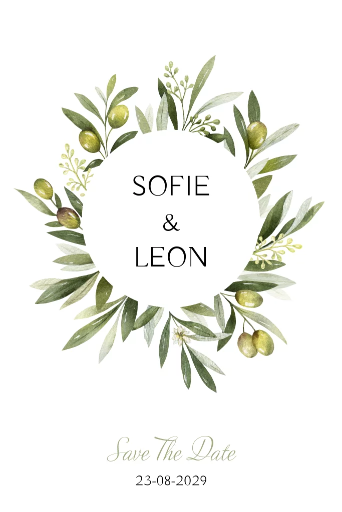 Laat je gasten alvast wegdromen naar een mediterrane sfeer met deze prachtige Save the Date-kaart. Het frisse ontwerp met olijftakken straalt rust, warmte en een vleugje Italiaanse charme uit. De subtiele groene tinten en het natuurlijke thema maken deze kaart een perfecte aankondiging voor jullie speciale dag. Kies ook voor de bijpassende trouwkaart met olijven.