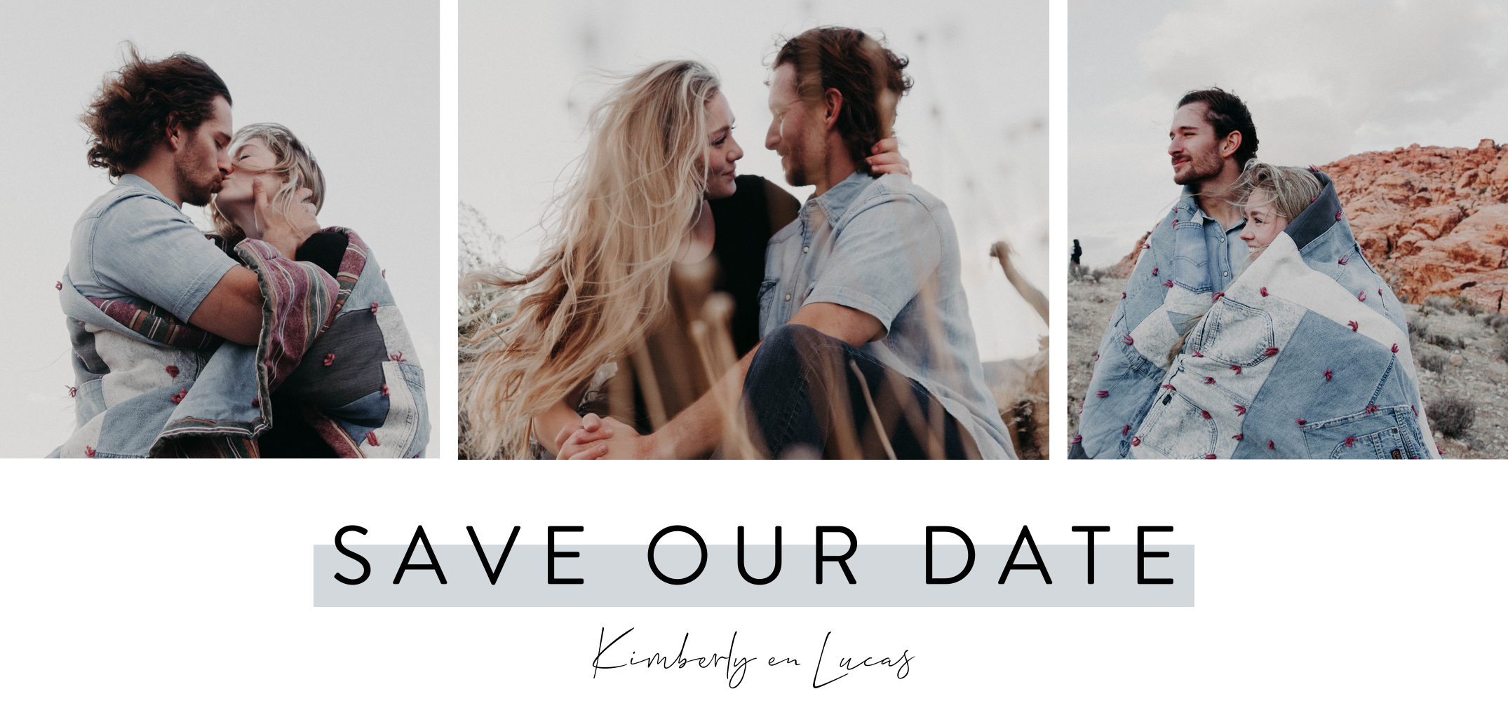 Kondig jullie bruiloft aan met deze moderne save the date kaart met strakke typografie en drie foto's. Door deze kaart te versturen kun je al je gasten alvast laten weten wanneer jullie in het huwelijksbootje stappen. De foto reeks maakt dit een persoonlijke kaart. Pas dit ontwerp aan naar eigen smaak in onze ontwerptool.