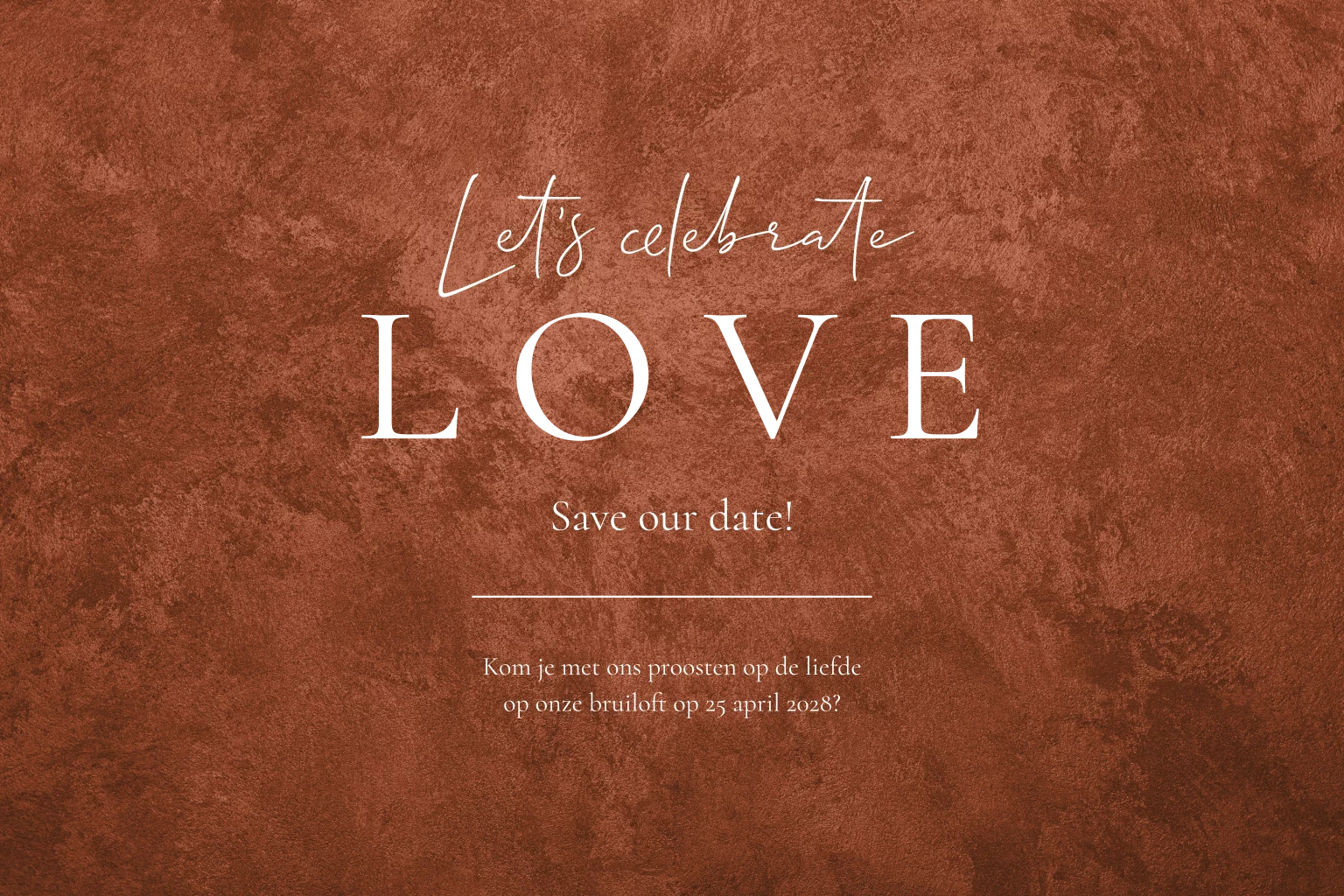 Stijlvolle save the date kaart met roestbruine waterverf achtergrond en foliedruk in roségoud. De afgeronde hoeken geven dit ontwerp net dat beetje extra. Liever goud- of zilverfolie? Pas de kleur van de foliedruk teksten zelf aan in onze handige designtool.