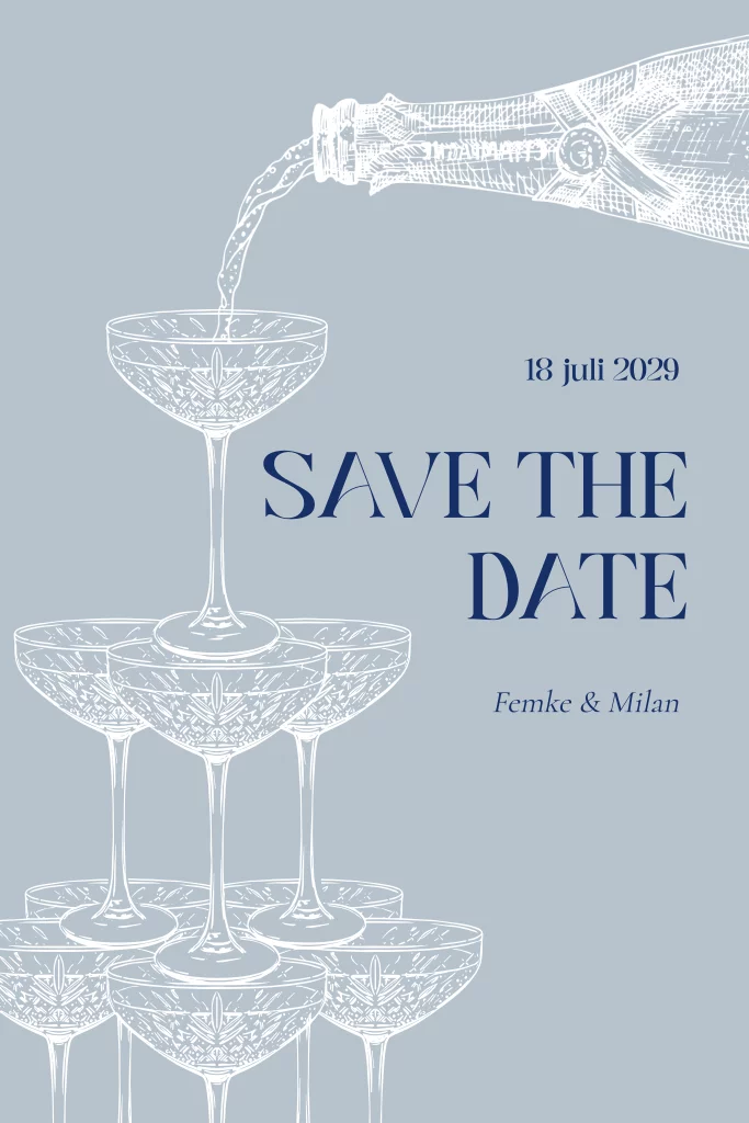 Laat jullie gasten alvast de datum reserveren met deze stijlvolle save the date kaart. Het ontwerp straalt klasse uit met een prachtige witte tekening van een champagneglazen-toren en een champagnefles die inschenkt, weergegeven op een zachte grijze achtergrond. De klassieke typografie en afgeronde hoeken zorgen voor een verfijnde uitstraling. Perfect om alvast een tipje van de sluier te lichten voor jullie grote dag!