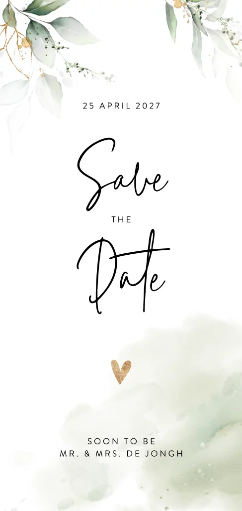 Op zoek naar een mooie save-the-date kaart? Wat dacht je van dit stijlvolle ontwerp? De kaart heeft lichtgroene bladeren en goudkleurige spetters. Met een hip lettertype staat er groot 'Save the Date' op de kaart. Achterop kun je de genodigden van alle nodige informatie voorzien.