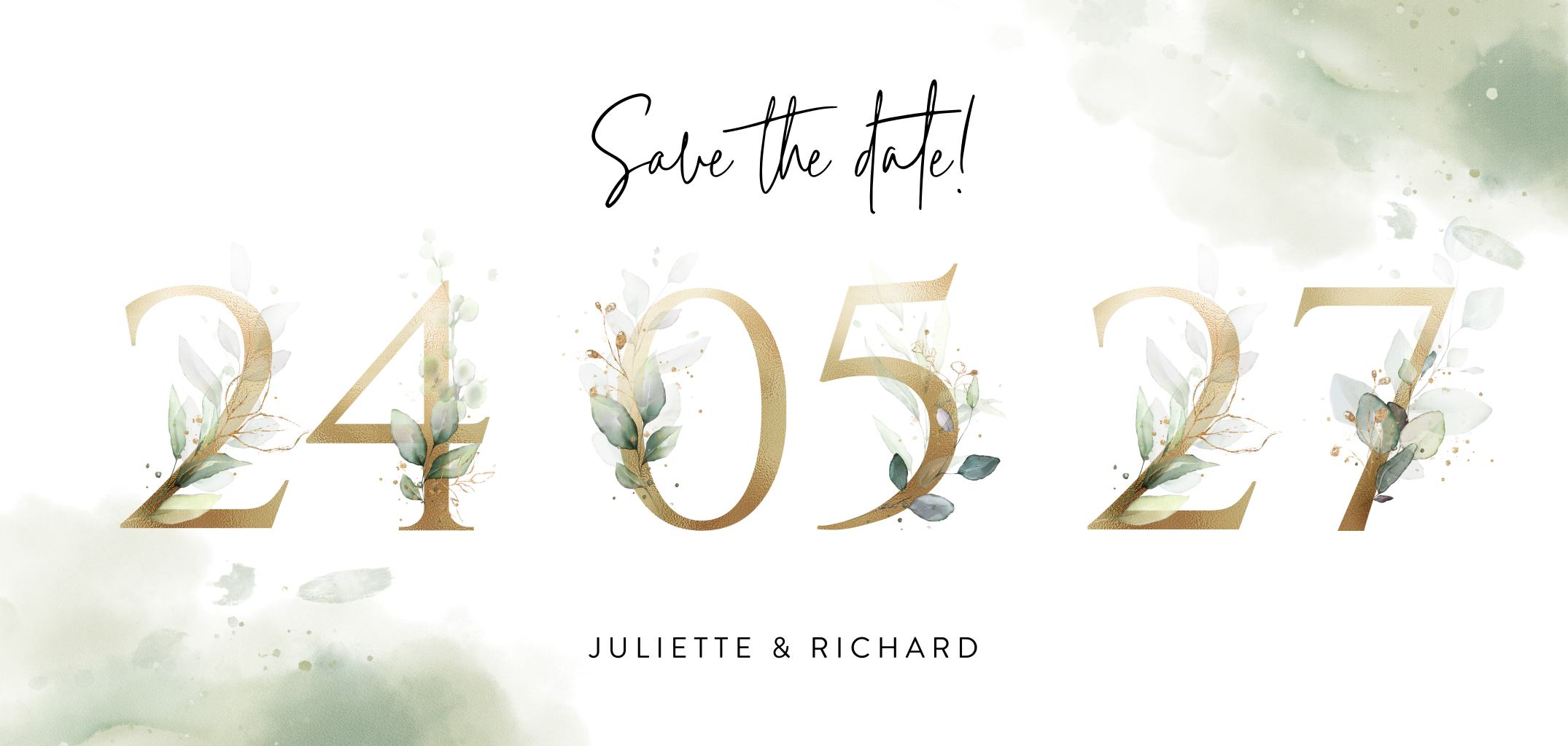 Een stijlvolle en botanische save the date kaart om aan iedereen te laten weten dat jullie gaan trouwen! De datum staat met mooie goudkleurige cijfers en blaadjes eromheen groot op de kaart. Kijk eens bij onze botanische trouwkaarten voor mooie bijpassende ontwerpen. Zeker als jullie trouwen in het groen is deze collectie met waterverf en bladeren een goede keuze!