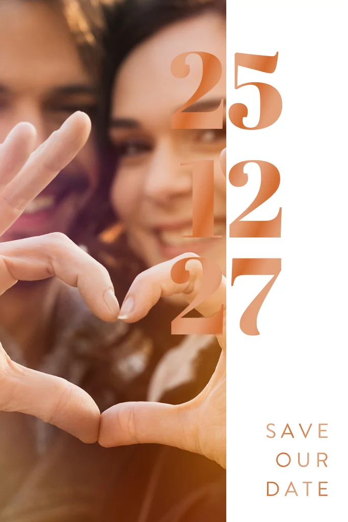 Hebben jullie trouwplannen? Dan wil je natuurlijk wel dat alle belangrijke gasten de datum vrijhouden. Stuur ze daarom deze persoonlijke save the date kaart met eigen foto en hoogglans datum. Toch liever een ander lettertype of meer spetters toevoegen? Pas dit kaartje aan in onze ontwerptool.