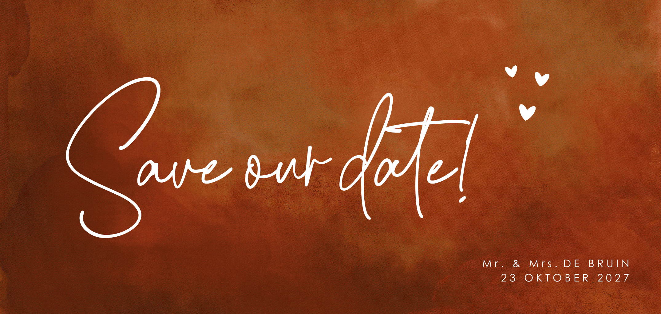 Een stoere save the date kaart in de trendy kleur steenrood met witte typografie en hartjes. Dit kaartje past perfect bij 'Moderne trouwkaart in trendy steenrood met groot YES'. Nodig alvast al je gasten uit voor jullie trouwdag, dan weet je zeker dat zij de datum vrij houden in hun agenda. Liever een ander lettertype? Pas dit kaartje eenvoudig aan in onze handige ontwerptool.