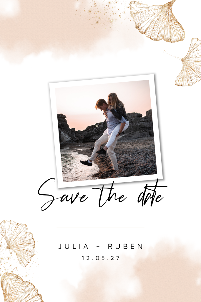 Save the date kaart met roze waterverf en ginkgo bladeren met foto
