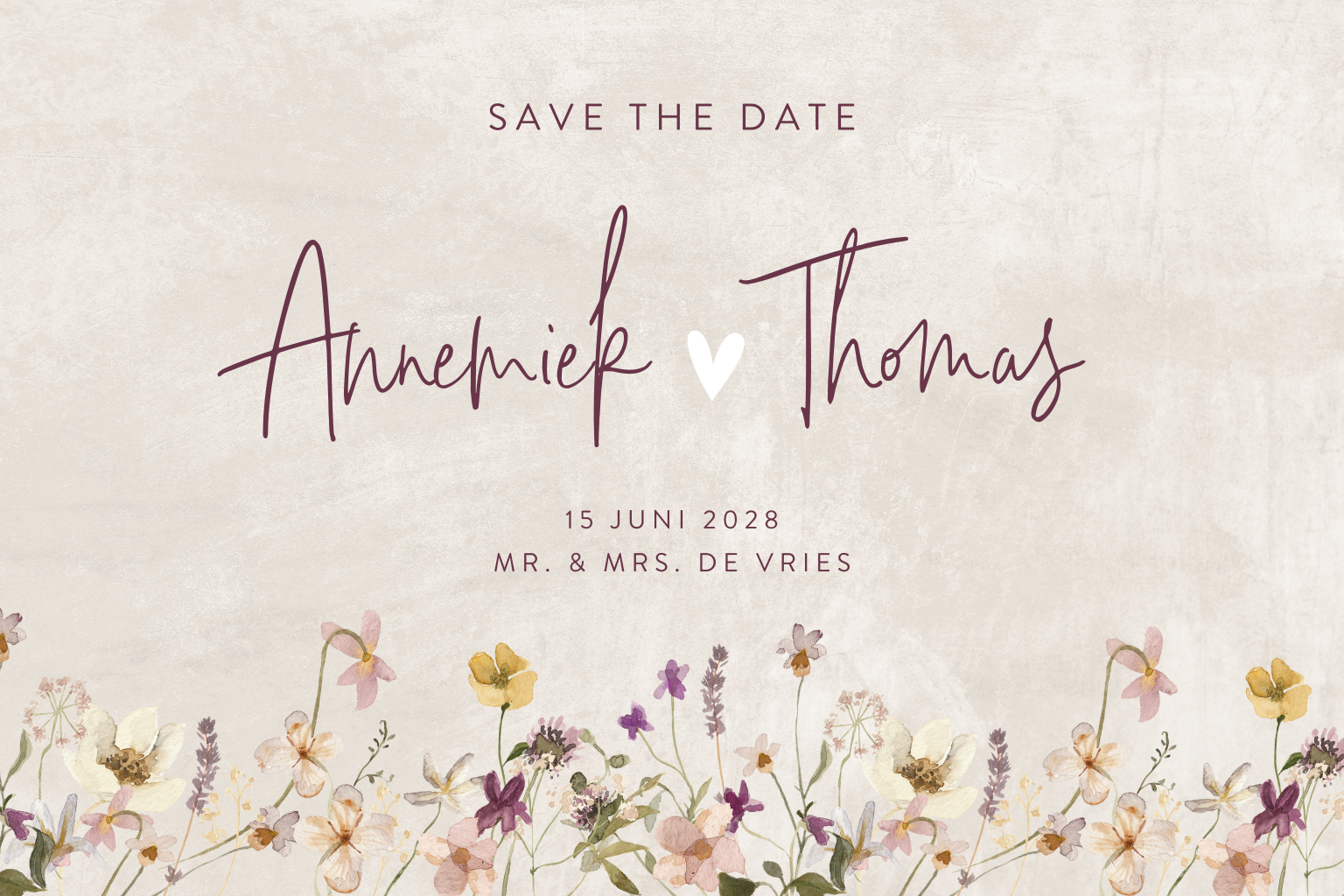 Chique save the date kaart met onder een strook met wilde veldbloemen op een beige ondergrond. Het goudfolie hartje tussen jullie namen maakt de kaart helemaal af. Aan de achterzijde staan de belangrijkste details vermeld en komen het foliedruk hartje terug. Het is een mooie aankondiging voor jullie speciale dag en een verzoek aan jullie gasten om deze datum vrij te houden in hun agenda's.
